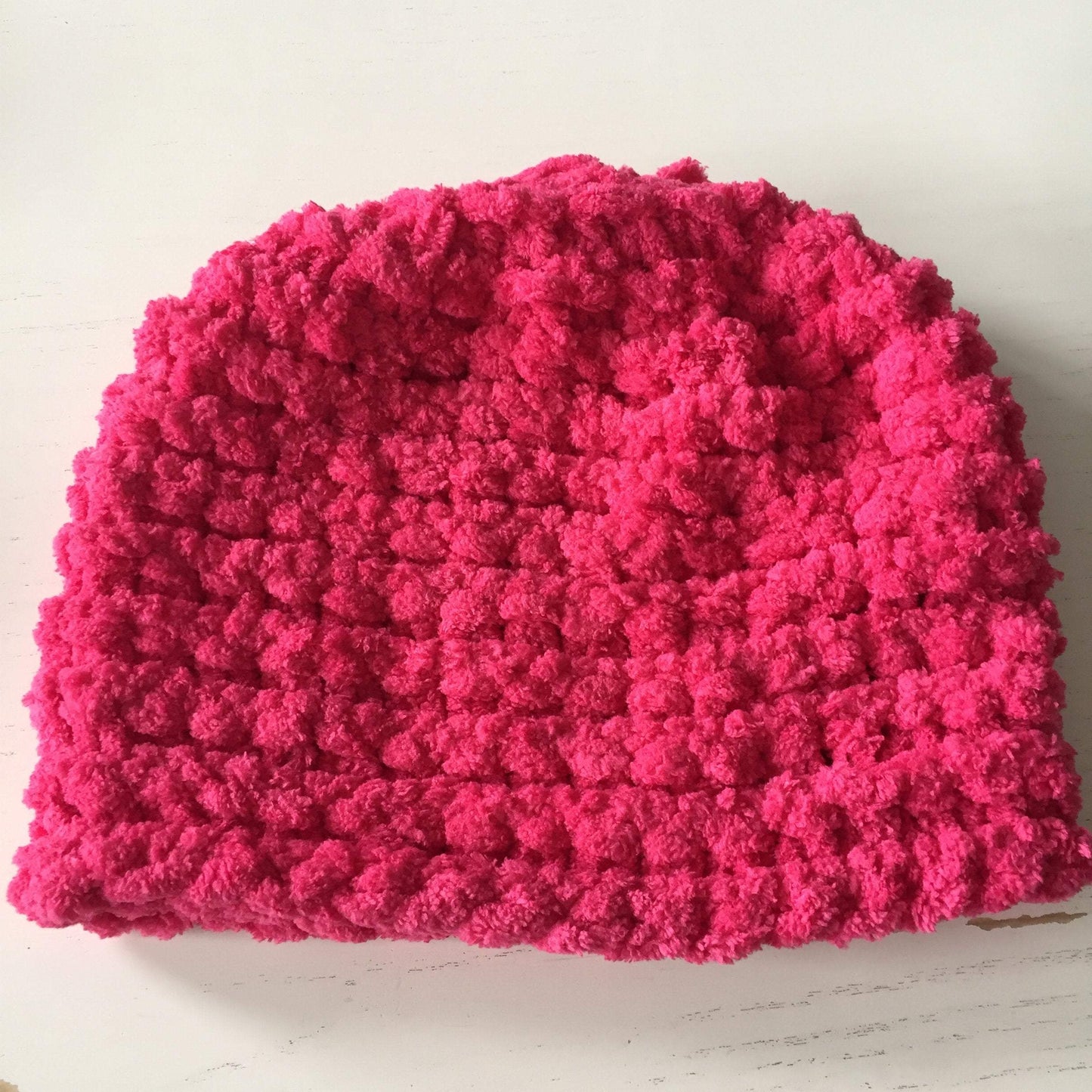 This super-soft, bright pink, handmade, chenille slouchy hat with a rolled brim, is knit using Bernat Alize Blanket-EZ yarn in Bright Pink (100% polyester). The hat is reversible, with a nubbly/bumpy texture on the reverse side (see the 4th picture).