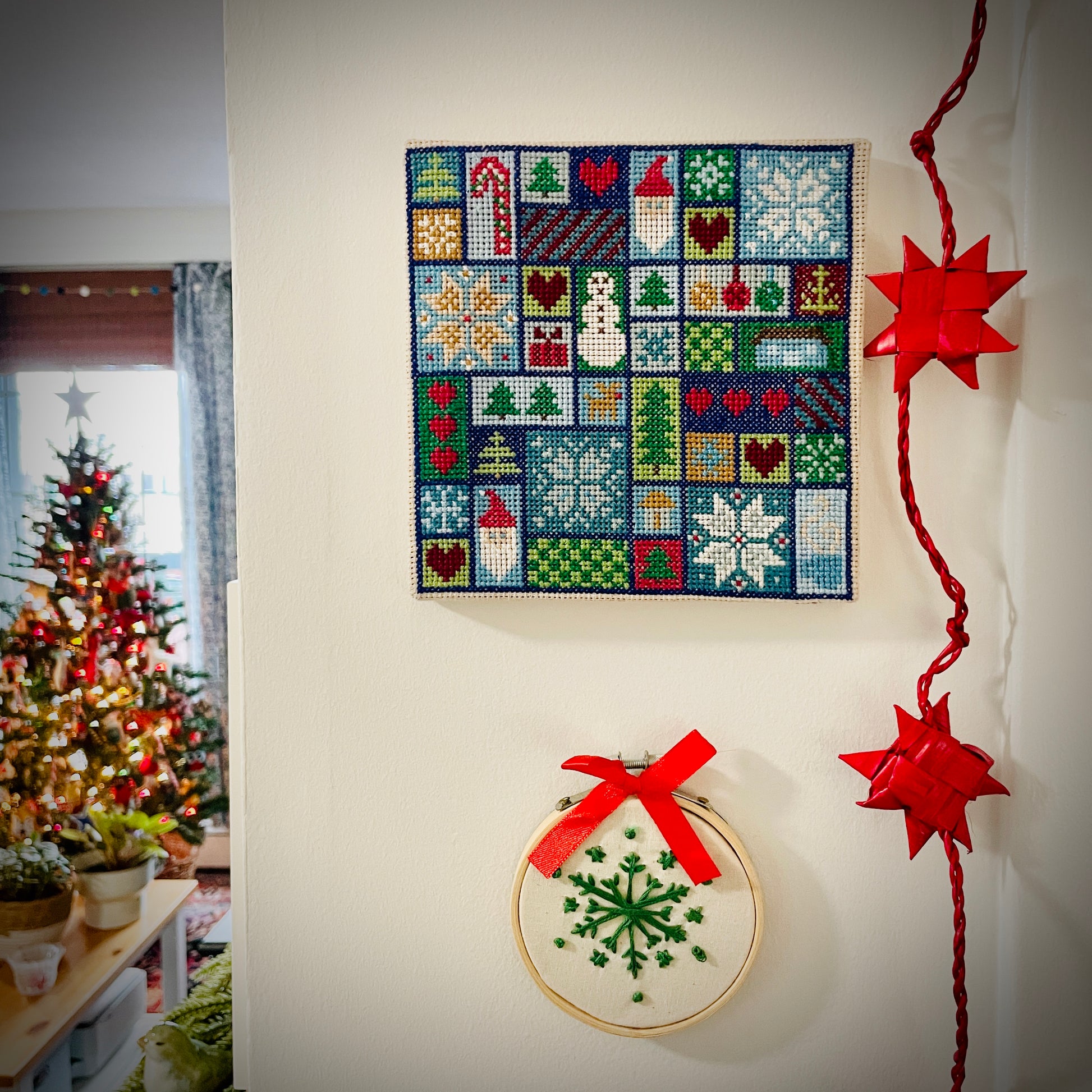 The Happy Holidays Cross-Stitch Pattern has a patchwork of motifs and patterns found in Norwegian sweaters and blankets, all with a Christmas/winter theme. This design was inspired by our original loop yarn finger-knitting blanket pattern, which can be found here.