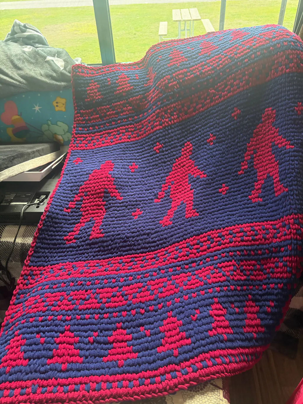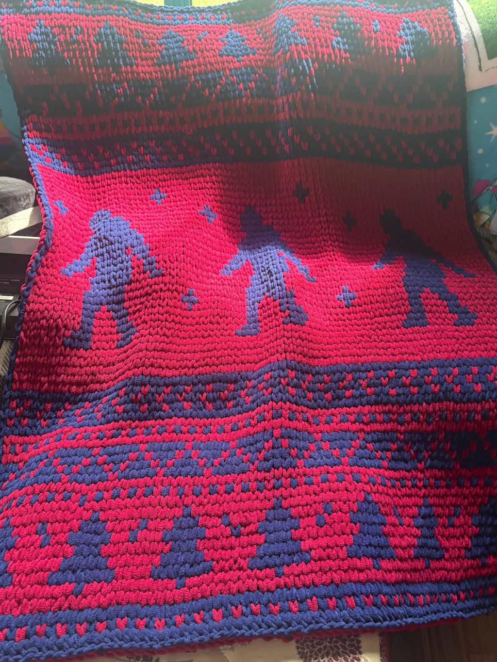 What a fun blanket to do! I added two more rows of one color to the bottom of the Sasquatch and two more rows on the top of them, which created a little longer blanket. My blanket took about eight scans of yarn was unable to locate the color that they showed in an example, but found that the red and blue made a beautiful blanket. Highly recommend this pattern I intend to do more of these type of blankets.