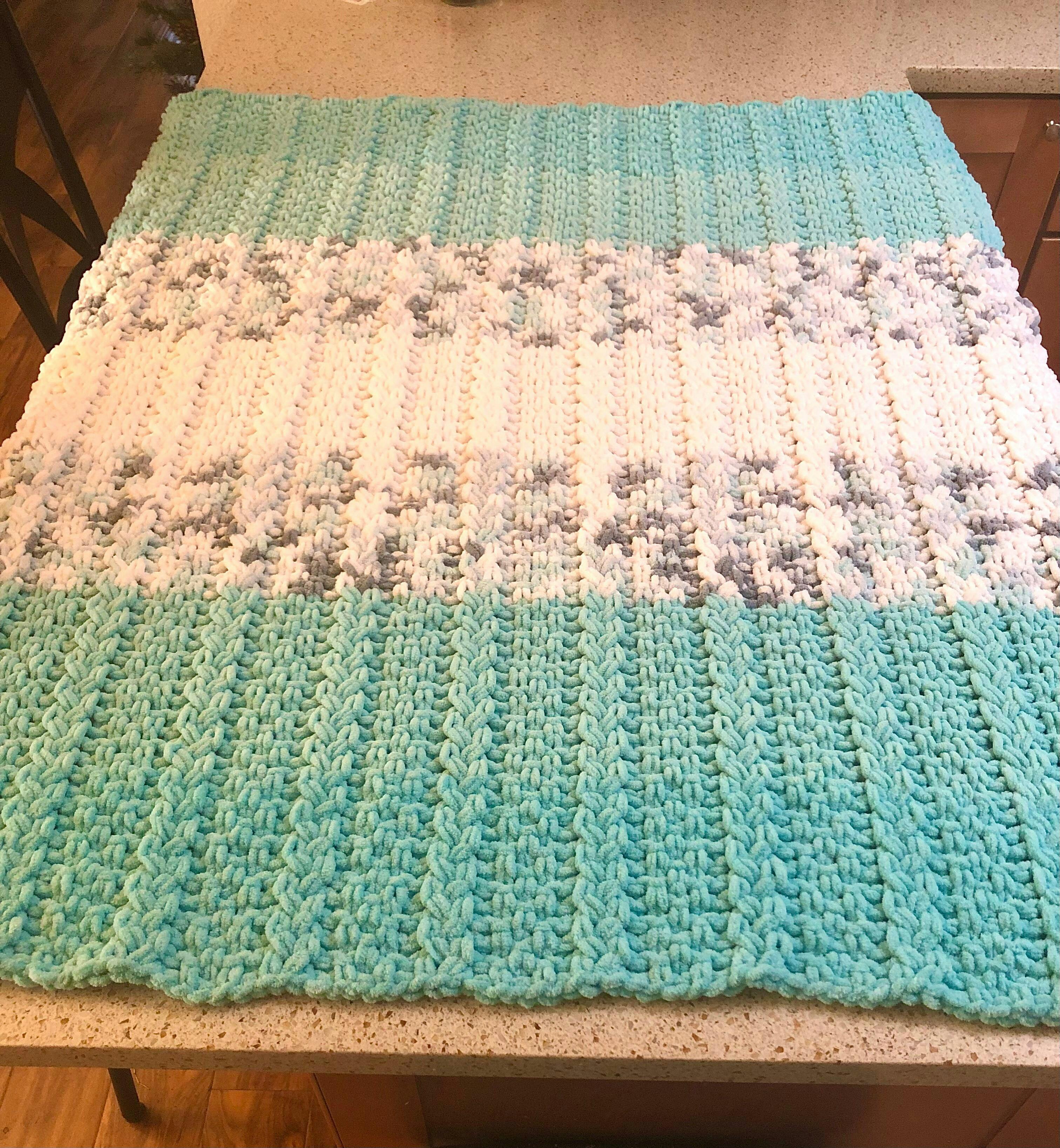Alize Puffy can be substituted and the blanket will be the same size, but you will need more skeins of yarn. Lion Brand Off-The-Hook, Lion Brand Crayola Off-The-Hook, and Red Heart Loop-It yarns can all be used with this pattern, but will yield a blanket with smaller overall dimensions. You will also need more balls/skeins to complete the pattern as is.